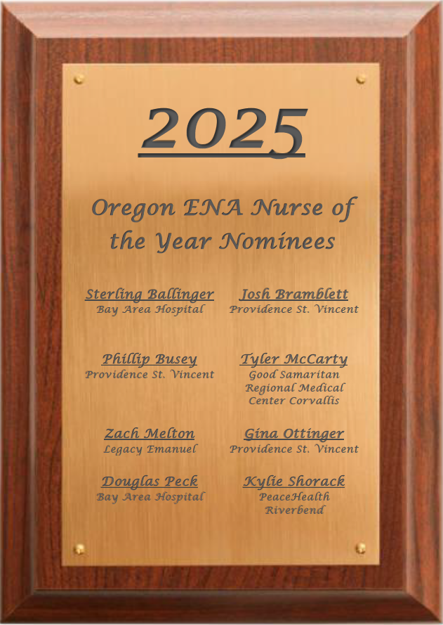 The Oregon ENA wishes to recognize an Oregon emergency nurse who exemplifies outstanding nursing practice as demonstrated through clinical skills, care, and compassion. This nurse is recognized by peers as an expert in emergency nursing and consistently exhibits traits associated with professional behavior and commitment to professional values.